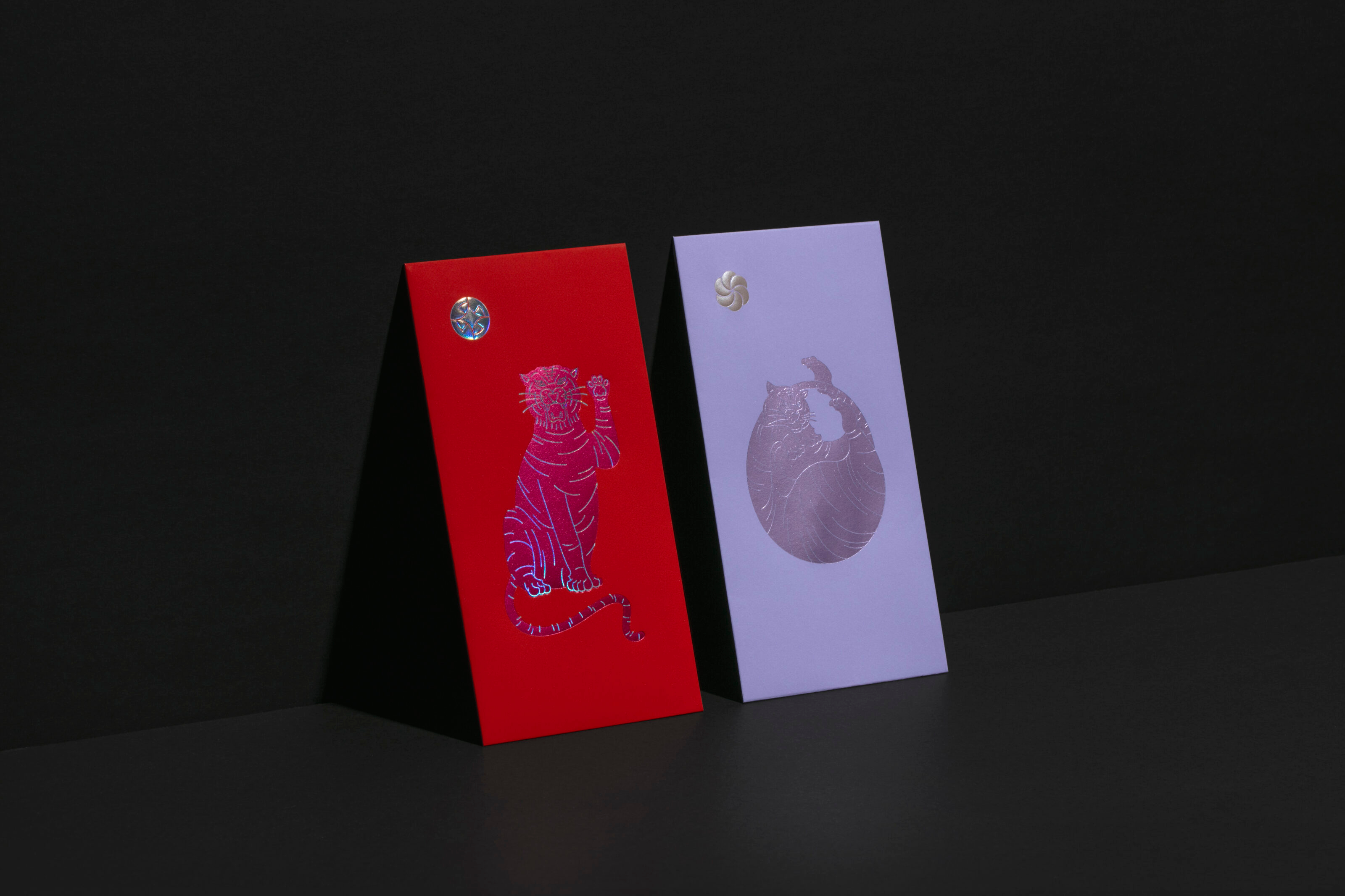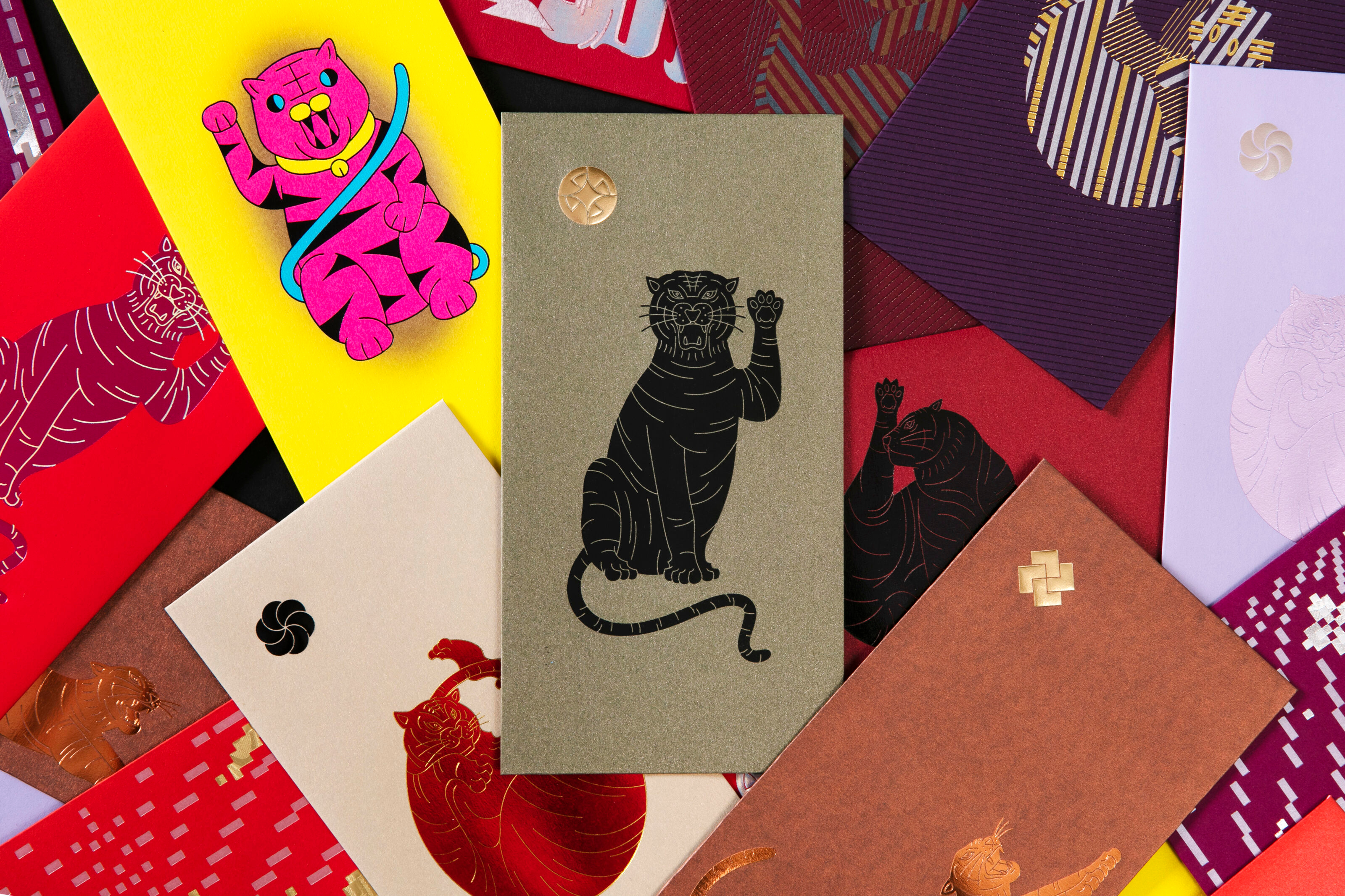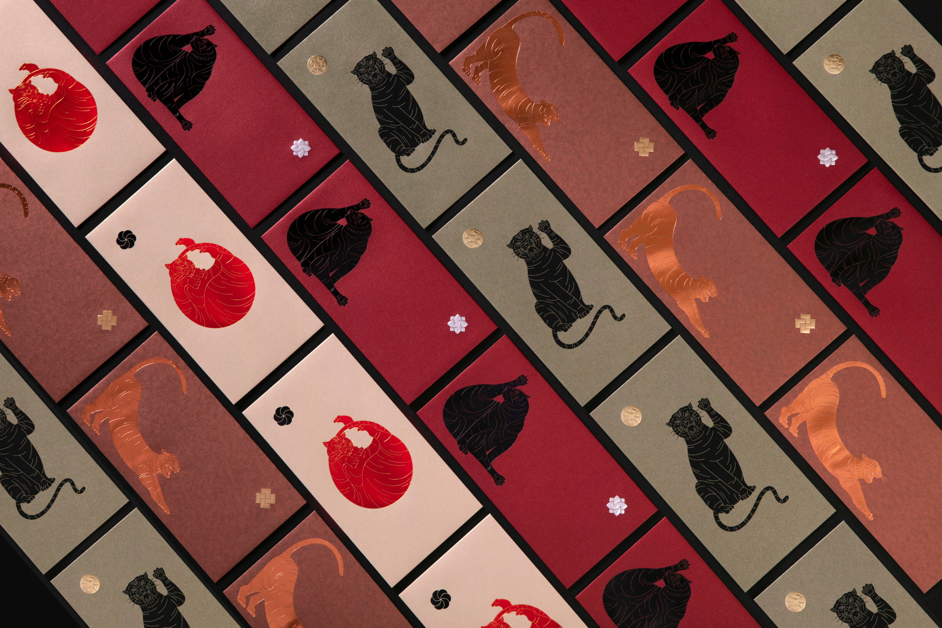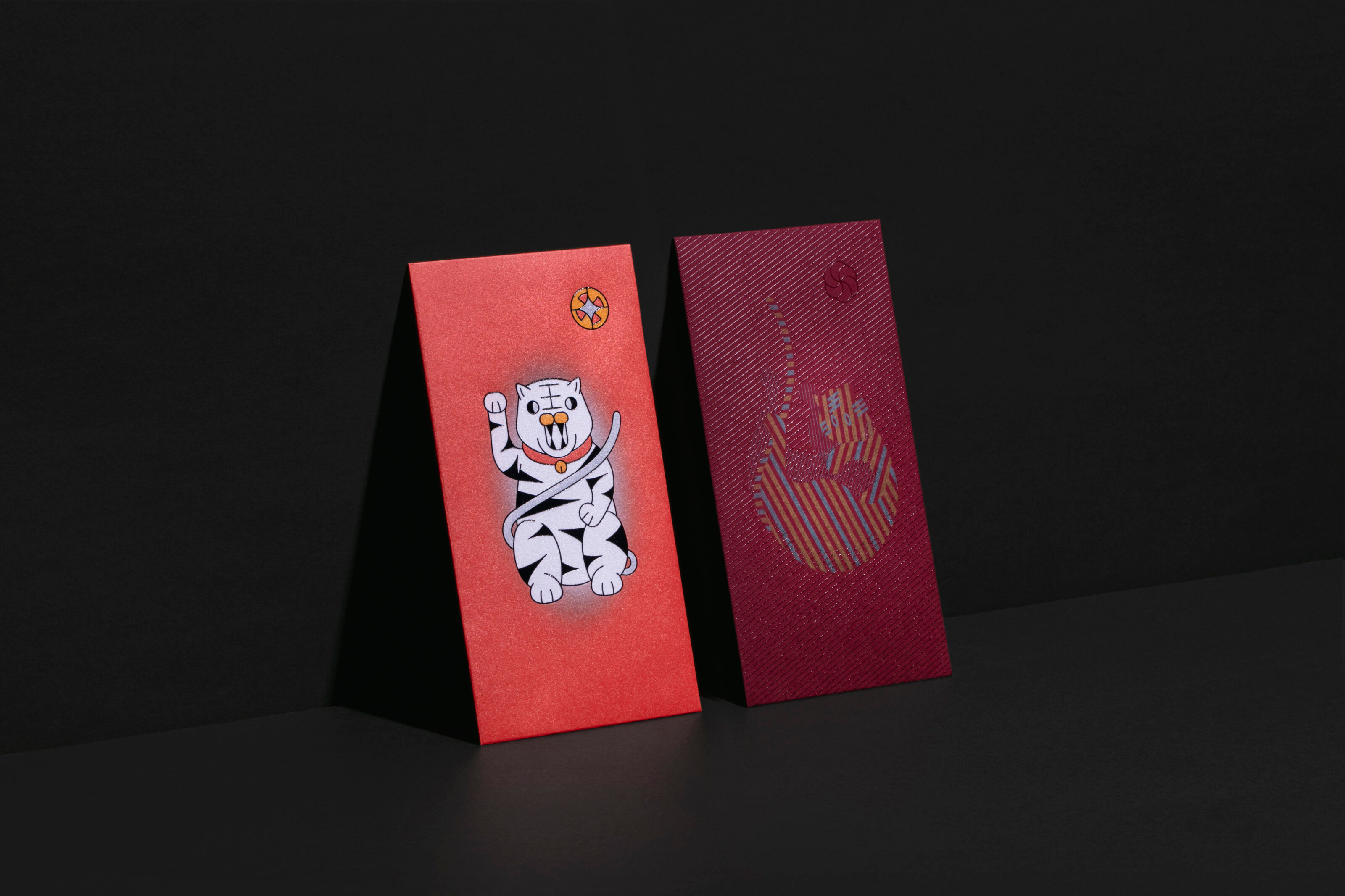 The tigers on the red packet design depict the different posture and action of the cat, such as the gesture of lucky cat and stretching. The different design styles and printing effects created a multiverse of tiger inside the red packet gift box.